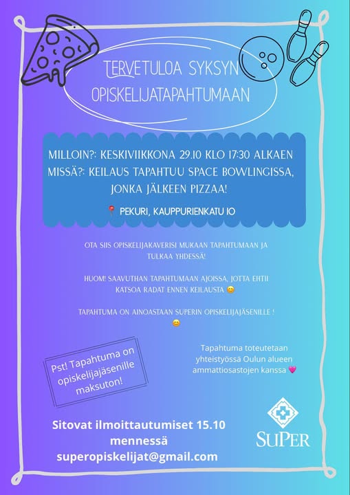 Illan ohjelmassa keilailua ja pizzatarjoilu – hyvä tilaisuus rentoon yhdessäoloon ja uusien opiskelijakaverien tapaamiseen.
